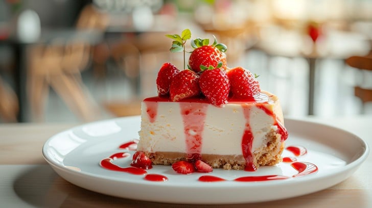 Cremiger, selbst gebackener Käsekuchen mit einem Hauch von Zitrone, serviert mit Erdbeersauce