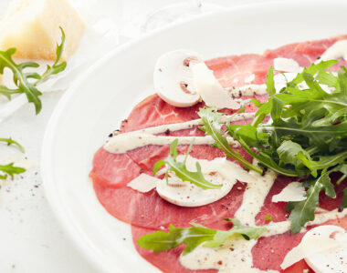 Hauchdünnes Rinderfilet mit frischen Champignons, Rucola und italienischem Hartkäse Gran Biraghi
