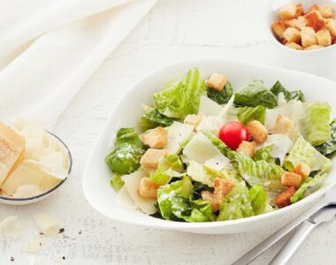 Lattich-Salat, hausgemachte Croûtons und italienischer Hartkäse Gran Biraghi. Wir empfehlen dazu unser hausgemachtes Caesar Dressing