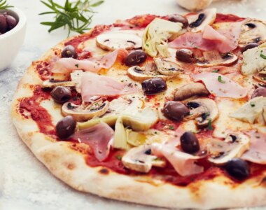 Prosciutto, frische Champignons, Artischocken und schwarze Oliven auf hausgemachter Tomatensauce und Mozzarella