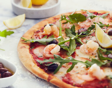 Gebratene Riesengarnelen, Rucola und schwarze Oliven auf hausgemachter Tomatensauce und Mozzarella
