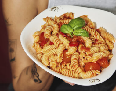 Hausgemachte Ricotta-RucolaRavioli mit frischen Cherrytomaten, Knoblauchscheiben, frischem Rucola und gerösteten Pinienkernen
