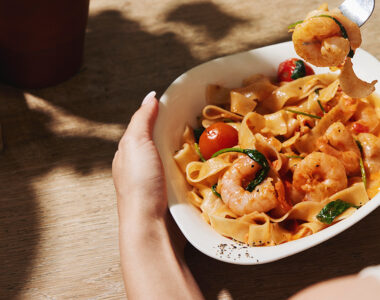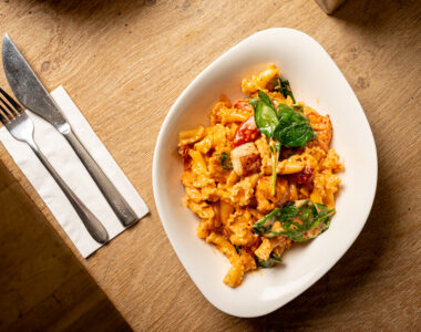 Riesengarnelen, hausgemachtes Basilikum-Pesto, verfeinert mit Rahm und dem italienischen Hartkäse Gran Biraghi, dazu frischer Baby-Blattspinat