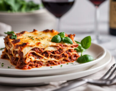 Der Klassiker – hausgemachte Lasagne mit pikanter Rinder- und SchweineragoutFüllung, frischem Basilikum, cremiger Béchamelsauce, dem aromatischen italienischen Hartkäse Gran Biraghi und knuspriger Mozzarella-Kruste